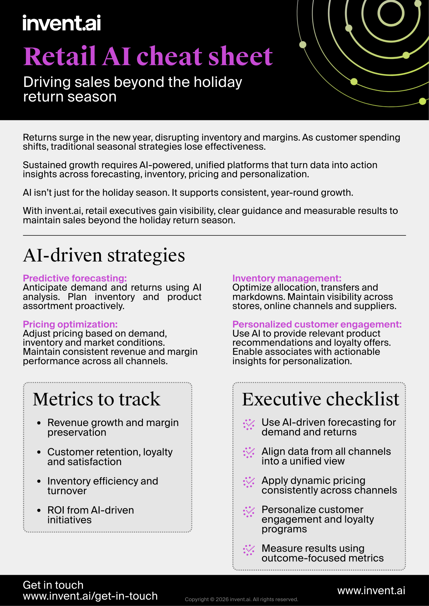 Ready to explore AI-driven strategies that deliver consistent revenue growth beyond the holidays? Discover how invent.ai’s platform supports advanced forecasting, pricing optimization and personalized retail experiences tailored to your business goals. Get in touch today.
